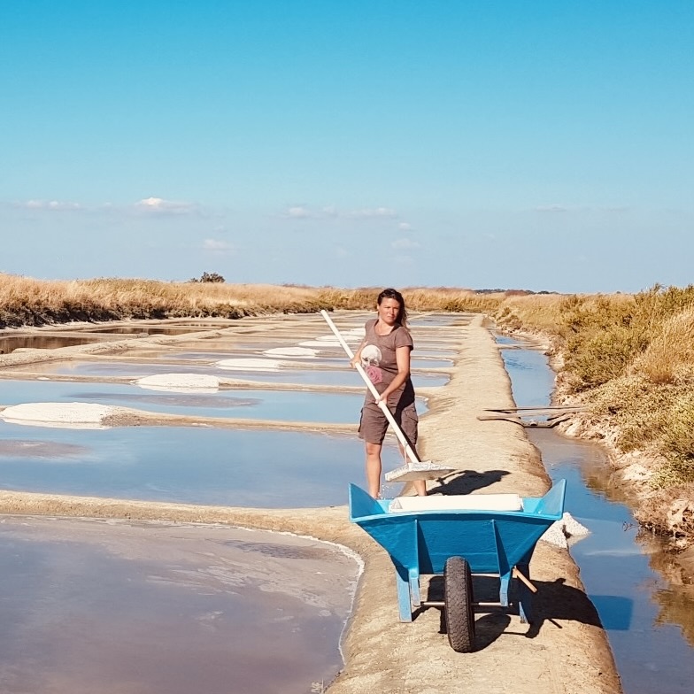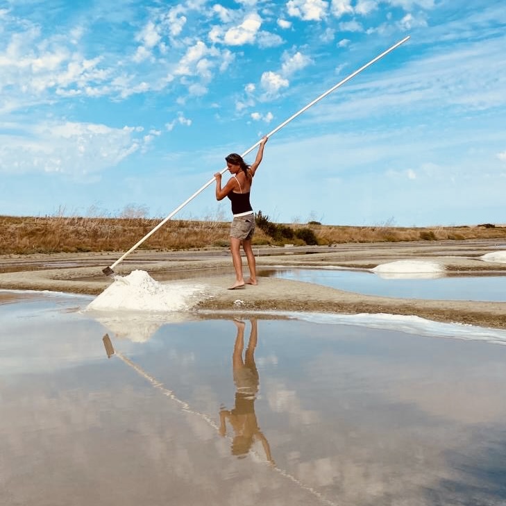 Biologiste de formation, l’envie d’une nouvelle vie et de rester sur l’île lui donne l’idée de reprendre un marais salant qu’elle rénove et réhabilite petit à petit. Plus de labo aux murs blancs, elle abandonne les pipettes aseptisées pour se lancer dans la production de sel, dans un décor qui passe du blanc pur à des camaïeux de bleu de l’argile où se dépose le gros sel, et à la surface de l’eau où flotte la fleur de sel.